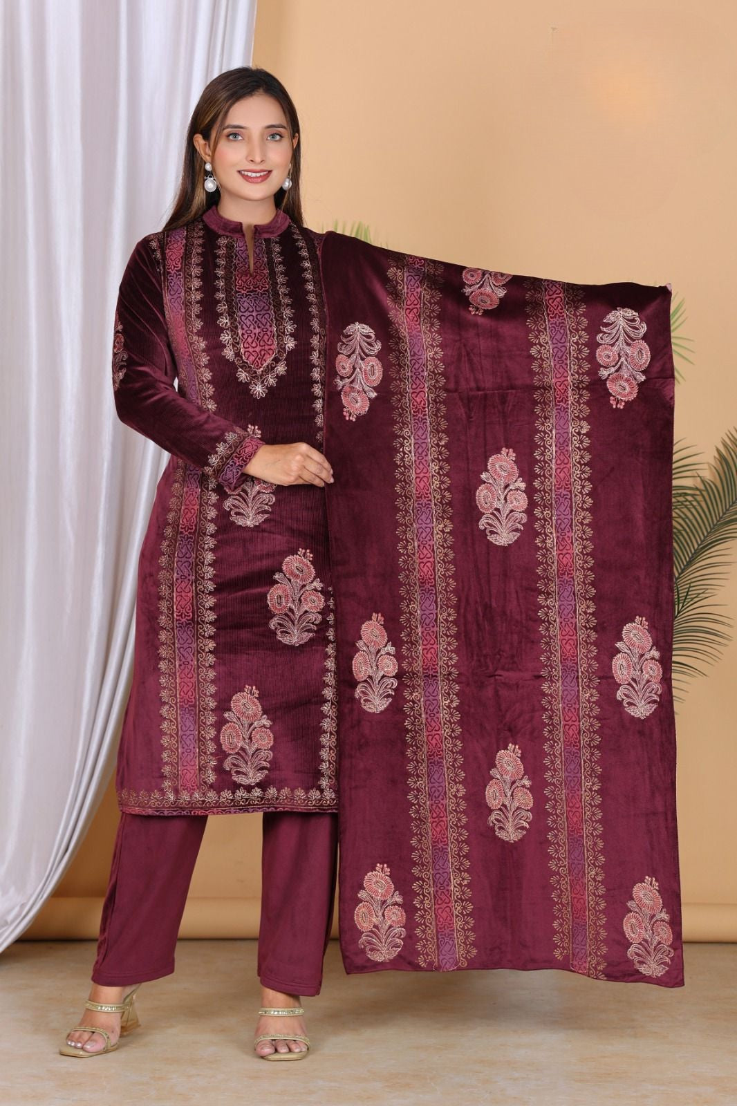 Step into elegance with this  wine-toned velvet set featuring traditional gold-toned prints and paisley motifs. The rich velvet offers warmth and sheen, while the straight-cut silhouette and bold print detailing give it a classic festive aura — perfect for winter weddings or formal evenings.